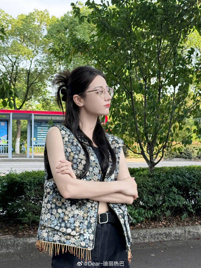 她也换上了印花的宽松上衣,搭配深色的牛仔裤,而此时的她也露出了自己那纤细性感的小蛮腰。一头柔顺的长发也被她整理得特别有个性,戴着一副大框眼镜的迪丽热巴,站在街头凹造型时,却也透露出一份书香气,显得更加的迷人了,嘟嘴卖萌的模样更是让人沉醉在她的盛世美颜当中了。