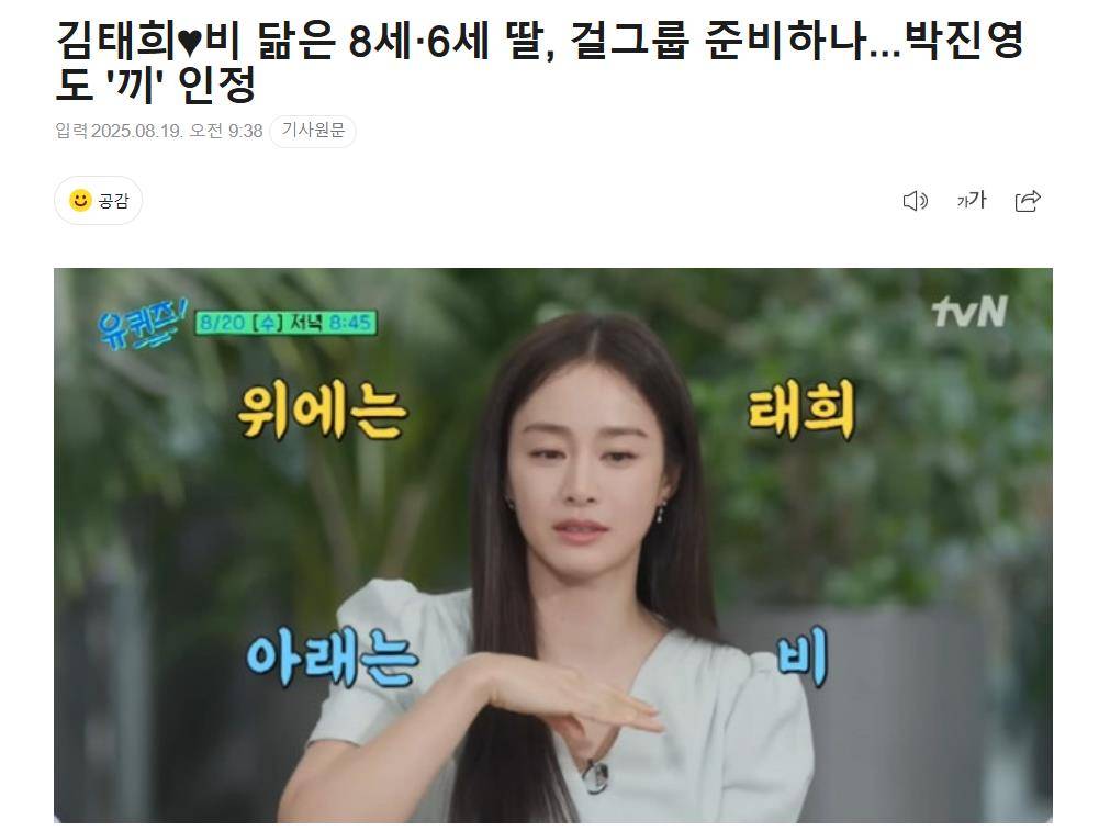娱乐圈最强基因组合金泰希和Rain的女儿们,还没正式露面就已经被预定"女团席位"了?据韩国媒体8月19日报道,金泰希在《You Quiz》里罕见聊起家庭生活,结果网友的关注点全跑偏——8岁大女儿和6岁小女儿不仅完美继承了父母的颜值,还被JYP大佬朴振英亲自盖章"才华横溢",这波操作直接让韩网炸锅:"星二代天花板预定!"
