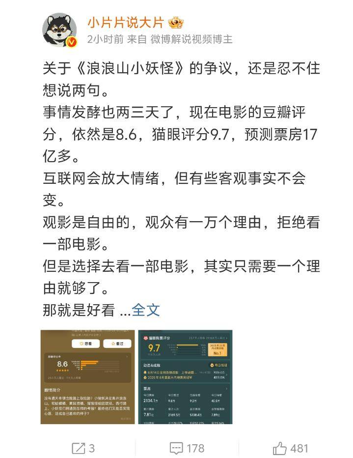 不过,有500万粉丝的电影大V发帖分析了《浪浪山》的票房。
