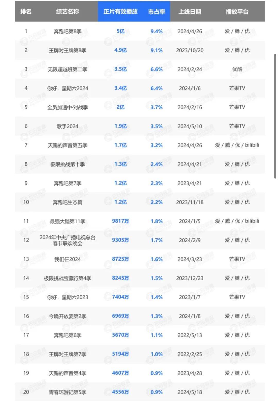 云合数据显示,今年上半年(2024.1.1-2024.6.30)综艺的供给有所回升,共上新126部国产季播综艺(不含衍生、晚会),同比增加7部;综艺大盘的走势整体向好,累计正片有效播放141亿,同比上涨5%。爱芒腾优四大平台综艺正片有效播放在27-41亿之间,其中优酷同比增长77%。