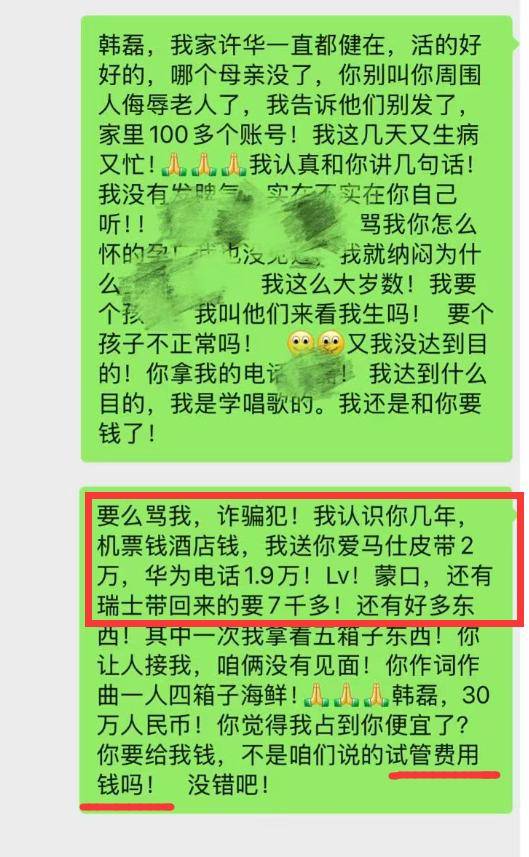 她还公布了双方的聊天记录,内容显示,韩磊曾用语音形式向她做出保证,但至今未兑现诺言,也无法联系到韩磊本人。