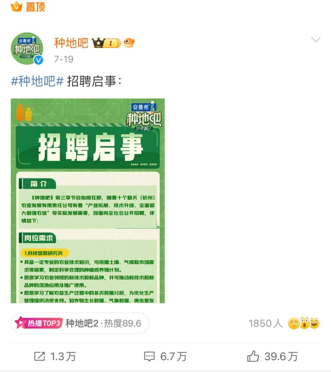7月19日,节目官微发布一则第三季的招聘启示,一石激起千层浪,四天过去,《种地吧》节目、节目常驻嘉宾十个勤天相关的话题,还在源源不断地为热搜榜贡献新素材。