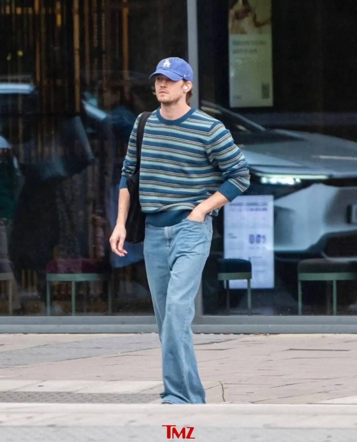搜狐娱乐讯 8月28日,霉霉前男友Joe Alwyn的一组照片流出,图中,他穿着蓝色条纹上衣搭配牛仔裤与蓝色棒球帽。