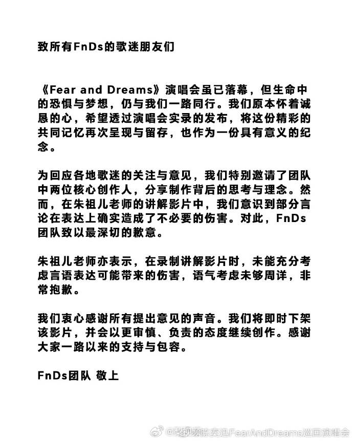 8月28日,陈奕迅团队紧急危机公关。官方账号发布致歉声明,承认朱祖儿的讲解影片“表达方式造成不必要的伤害”,并宣布立即下架该视频。朱祖儿本人也紧随其后道歉,称“录制时未充分考虑言语带来的伤害”。然而这份迟来的歉意,并未能平息粉丝的愤怒。