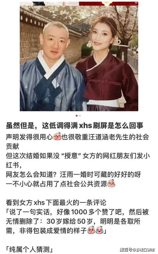 搞笑的地方在于哪里呢?当汪雨的新婚妻子发结婚的消息之后全网沸腾,汪雨跟着发了一封说明,总结就是要保持低调。新婚妻子把这张图片发在了自己宣布结婚的评论区里。而且,一口气就刷出了四五个同样和新婚妻子有着类似长相和风格的小网红们,蹭热度发了汪雨和崔璨的亲密照。就是说,新妻子在用高调的行动践行着他们低调的生活原则。
