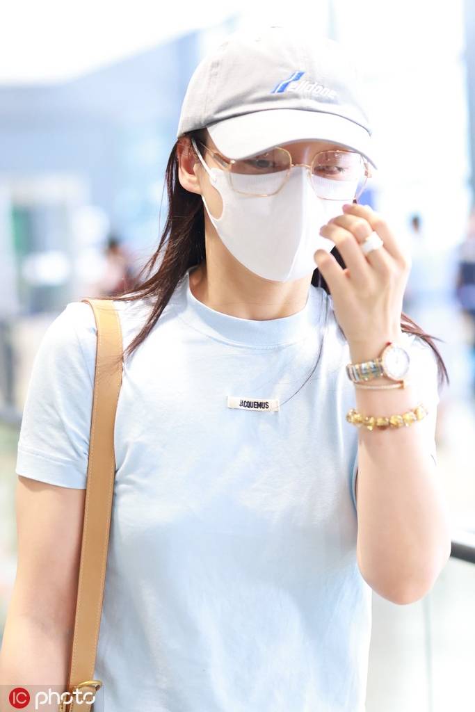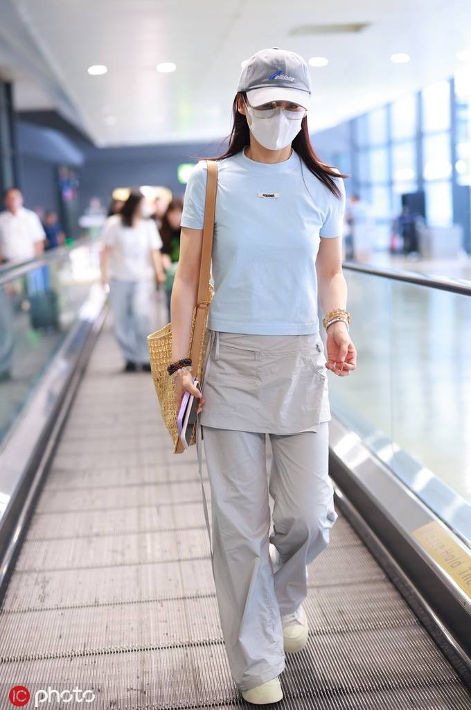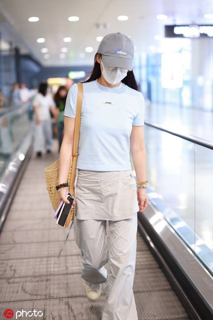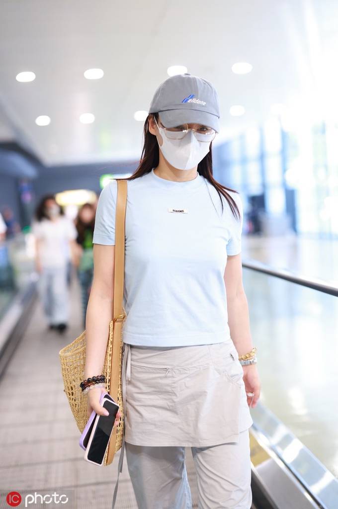 袁姗姗现身机场,浅色T恤米色短裙搭配长裤个性别致。