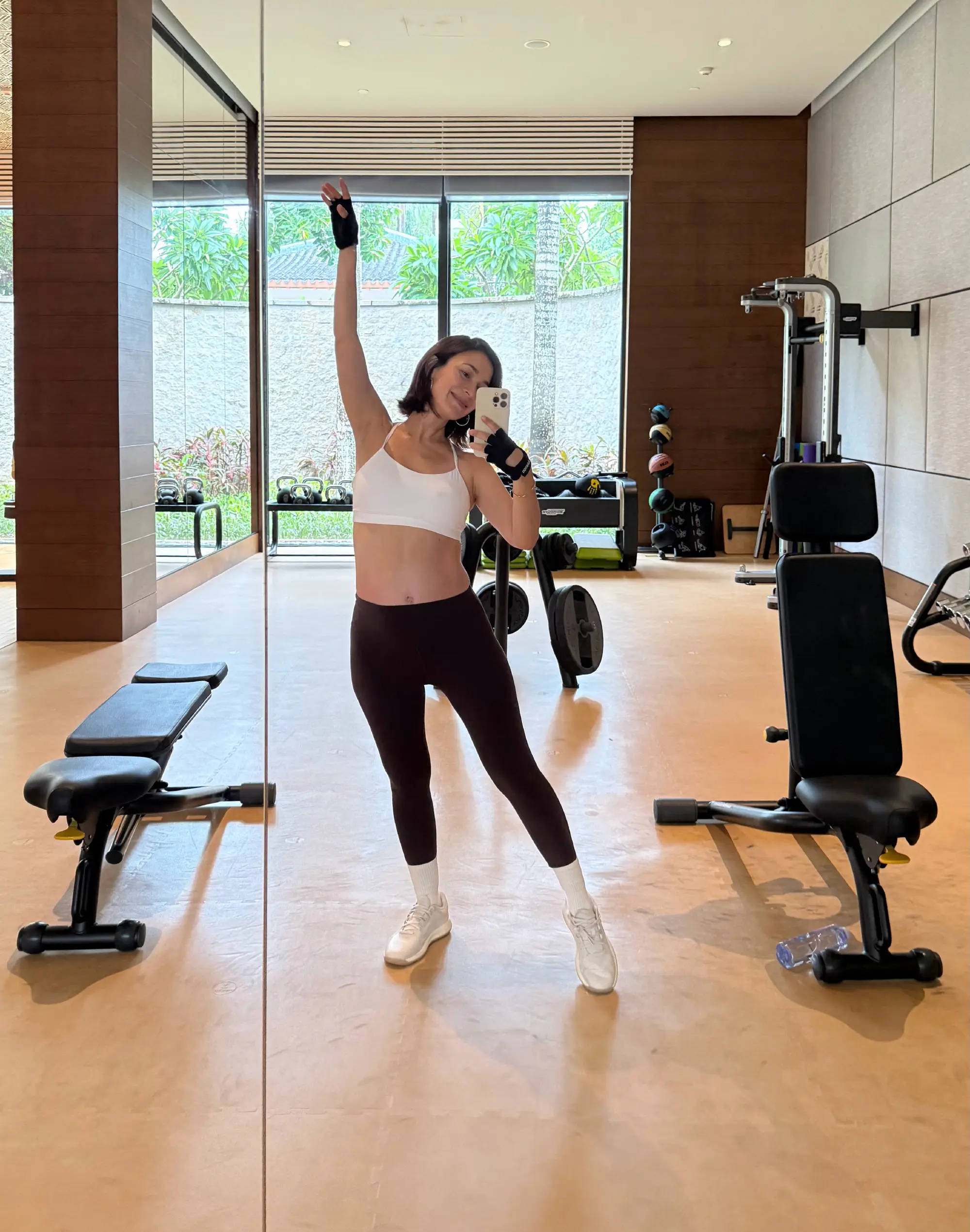 卢靖姗怀孕后一直在坚持健身锻炼。
