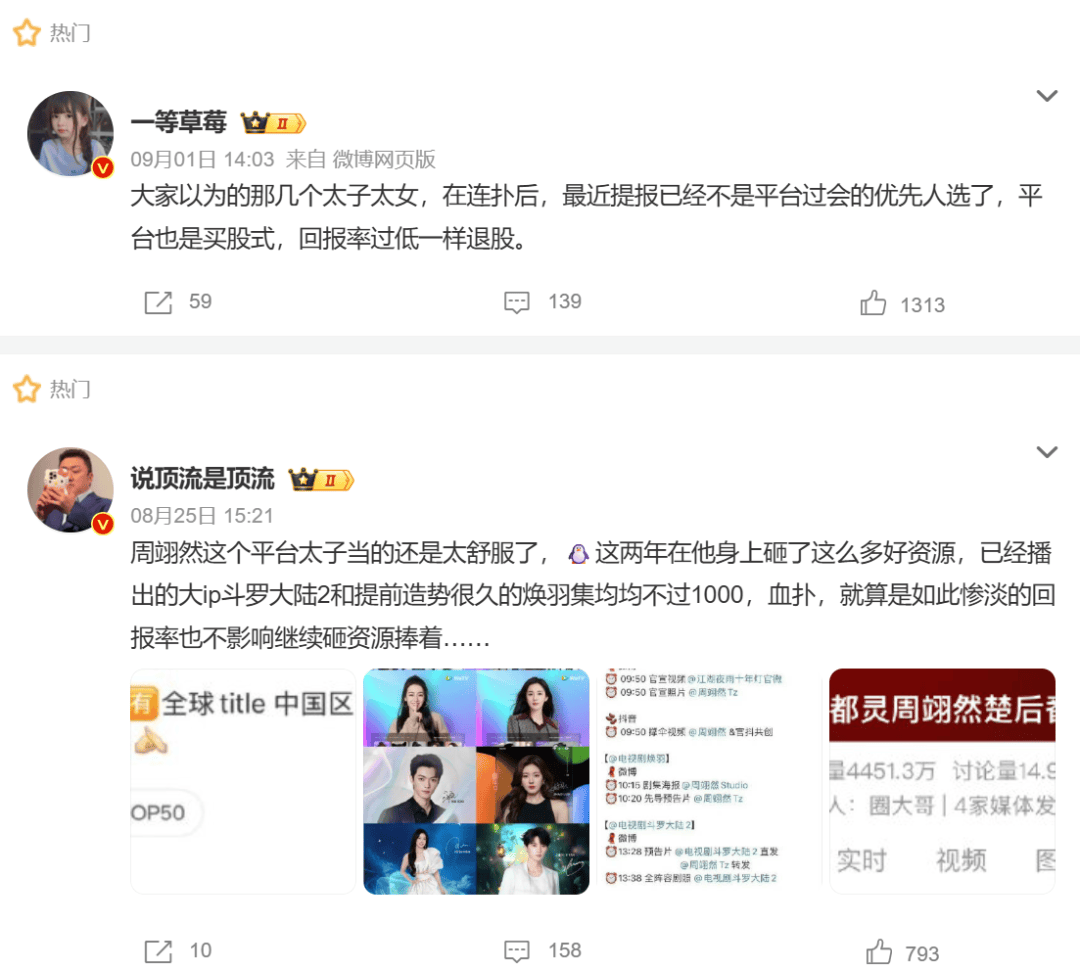 果在于,平台自己造星,扶持新人并与之分约,是一种降本增效的方式。因则在于,平台对这些新人催熟意图明显、手段又相对单一,不管合不合适都将人往古偶里塞,很多时候人与IP不是相互带动,反而相互消耗。如初代待爆中的张晚意,靠正剧走红,对表演有自己的想法,如果不是那几部流水线古偶,良币光环应该还能维持更久一点。