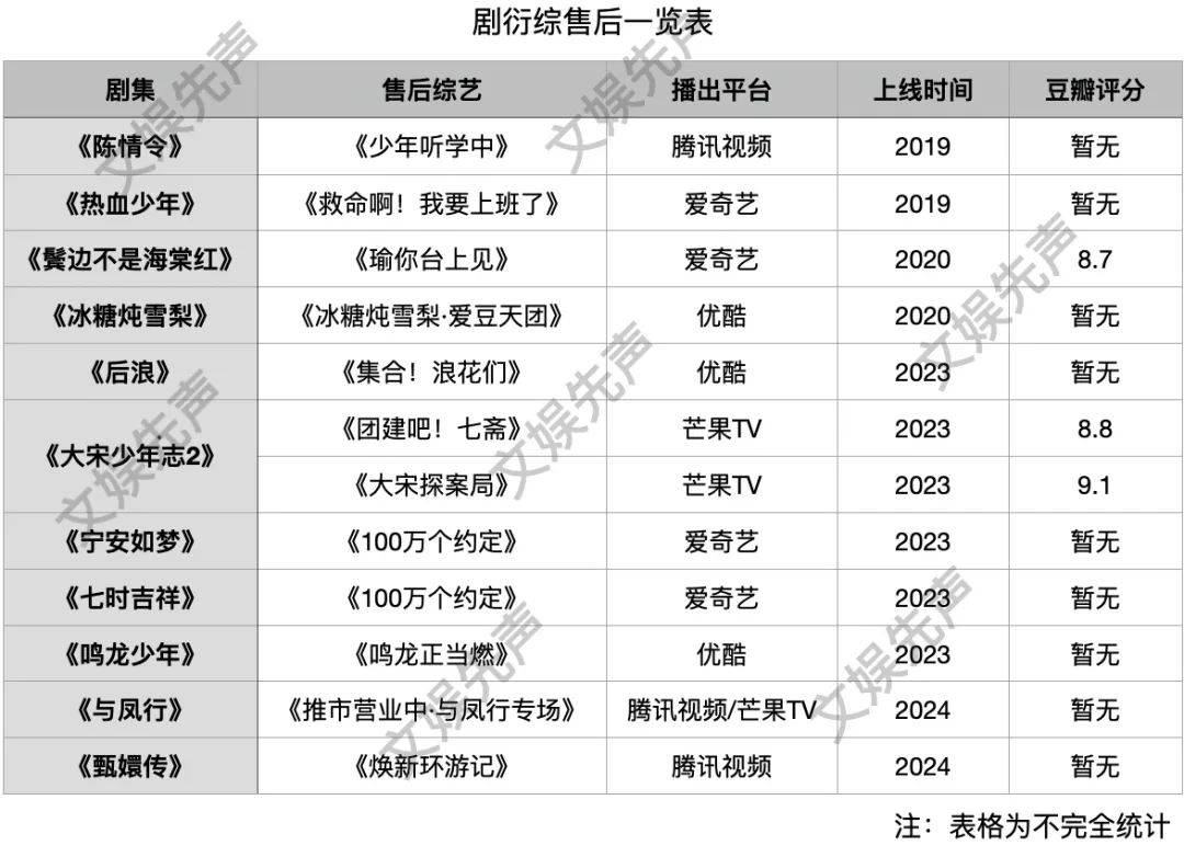 整体来看,爆款剧的售后综艺虽然热度不如剧集,但比起新综艺,仍然有一定的粉丝基础。不过,情怀牌之外,售后综艺仍然需要探索创新玩法,深入挖掘IP衍生价值。