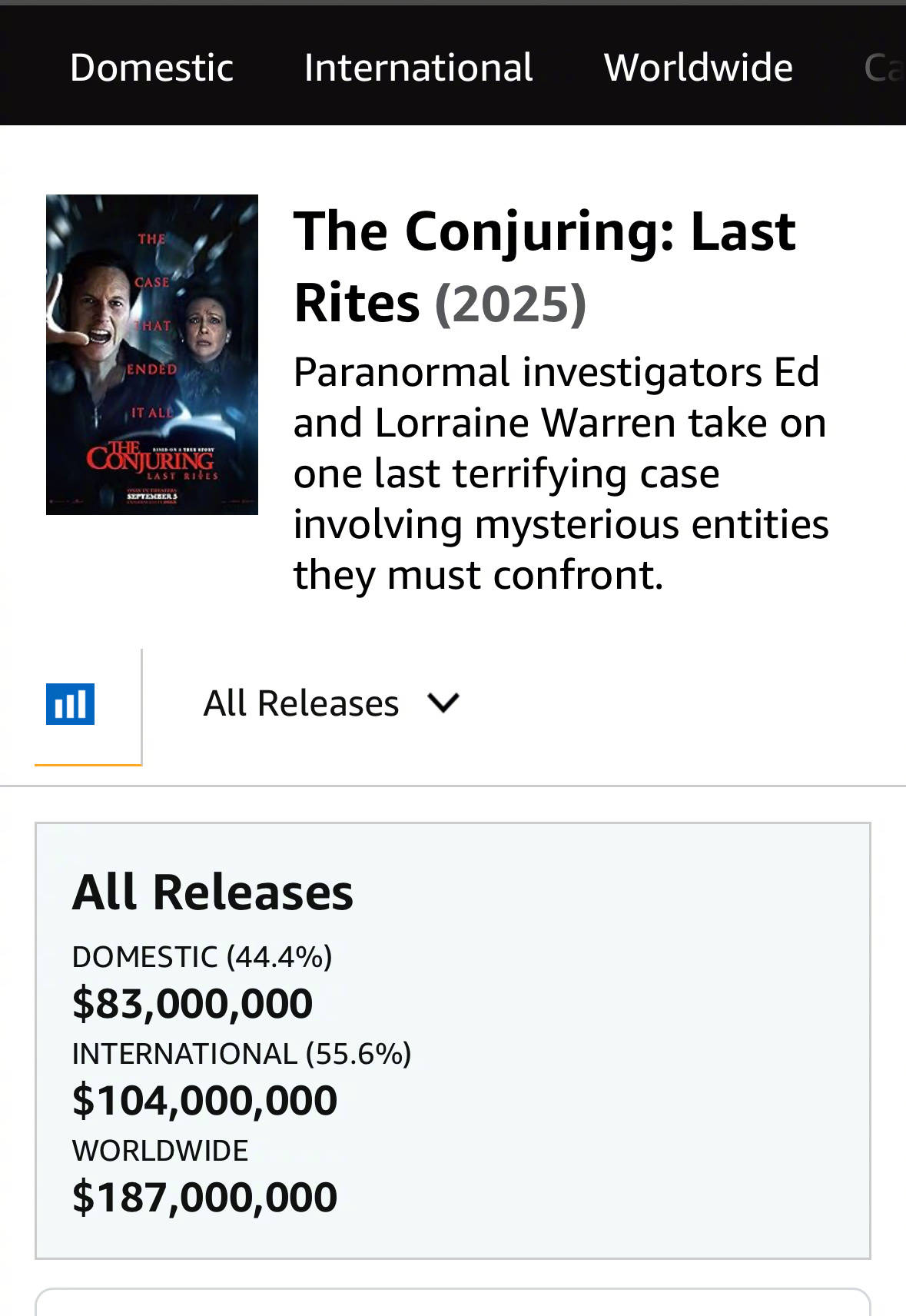 搜狐娱乐讯 超人气系列恐怖片《招魂》最后一部《招魂4:终章》9月5日(上周五)在北美及海外多地上映,北美首周末三天粗报8300万美元、海外票房1.04亿美元,全球首周累计1.87亿美元(业内早期预估该片全球开画仅8000万),皆为该系列最佳首周成绩,创影史恐怖片开画第三高。
