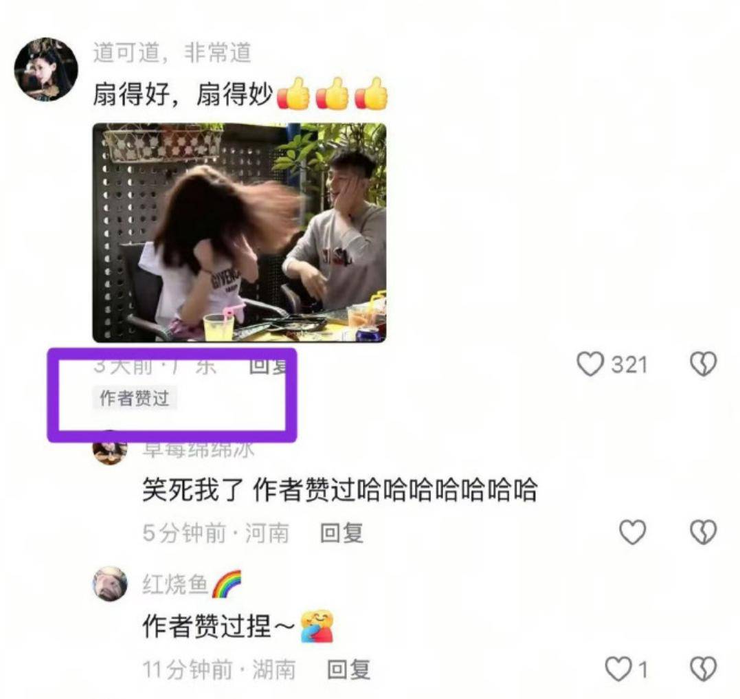 除此之外,演员潘宥诚在自己的视频中,也曾点赞过和虞书欣互扇巴掌的评论,疑似是在内涵对方的行为