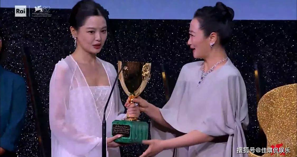 辛芷蕾穿着香奈儿礼服优雅的走上颁奖舞台,赵涛亲自给她颁奖。赵涛和辛芷蕾在舞台上拥抱在一起,两位漂亮的中国女人这一夜闪耀威尼斯。辛芷蕾从赵涛手上接过威尼斯电影节最佳女主角的奖杯,她把奖杯抱在怀里。赵涛把这个舞台留给了辛芷蕾,她眼神里都是骄傲与欣赏,这可是她亲自选出来的女主角啊。