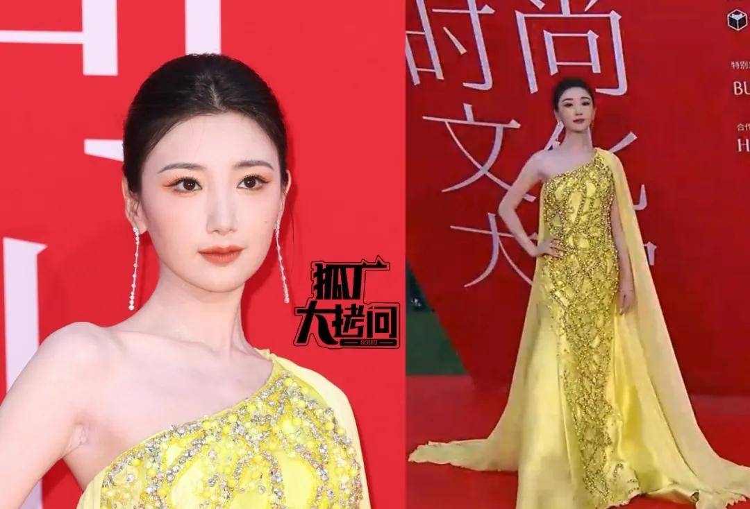 周洁琼穿了一条金色长裙,在闪光灯下有点像从海里刚上岸、闪着金光的美人鱼,不过比起礼服,还是她的美貌更抢镜。