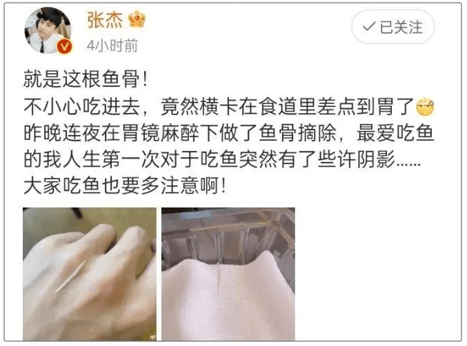 此前,张杰也有被鱼刺卡住的经历,还手术取出。