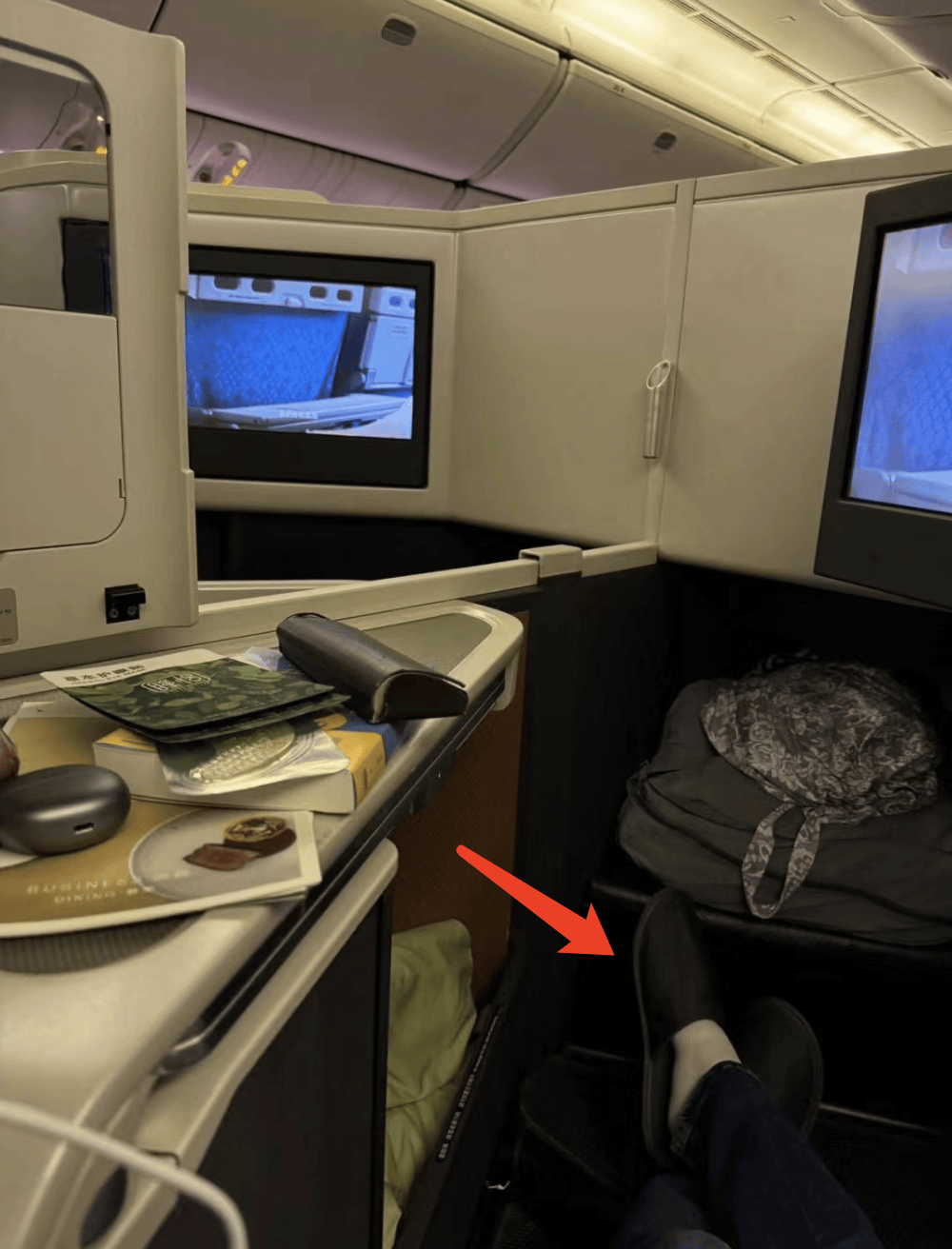 郭晶晶分享了自己在机舱里的场景,已经换上了拖鞋,目测是躺着休息,十分惬意。