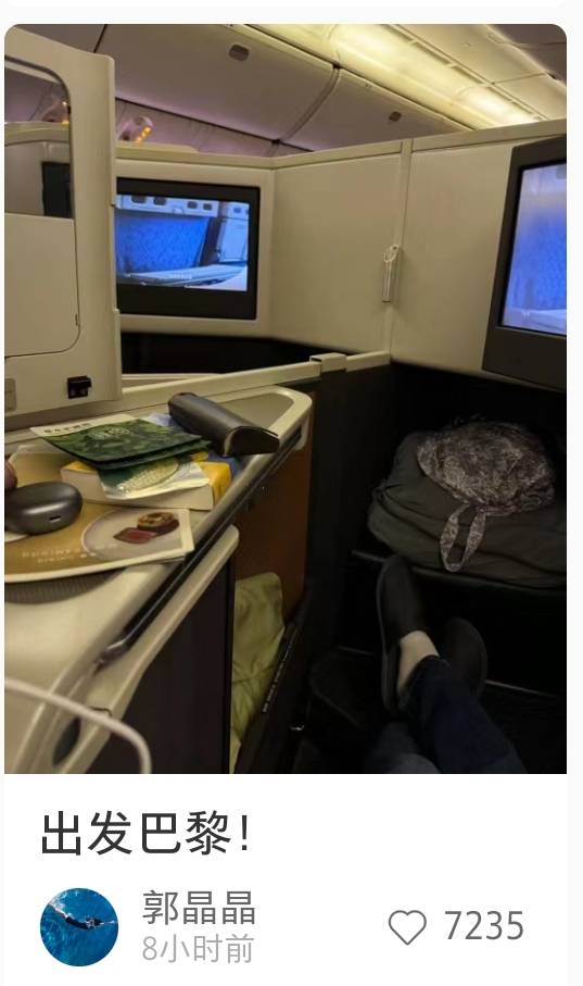 中国飞往巴黎,路途遥远,郭晶晶需要更好的休息,以不影响工作,公务舱比经济舱舒适度更强一些,所以这是一个不二之选。