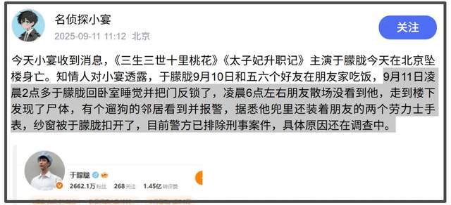 目前于朦胧坠楼具体原因仍在调查当中,他还这么年轻,希望公司回应一下吧!