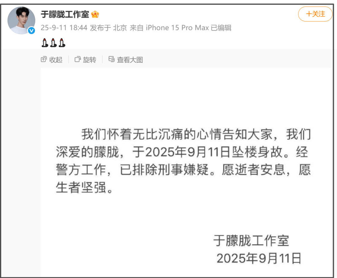 目前于朦胧工作室已出面回应,证实于朦胧于2025年9月11日坠楼身故。经警方工作,已排除刑事嫌疑。