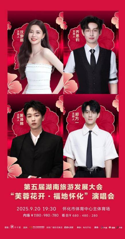 沈梦辰、齐思钧、吴泽林、郑方一四位主持人组成的超强阵容,堪称“全能型主持天团”。沈梦辰凭借丰富的舞台经验灵动控场,齐思钧以机智反应和高情商巧妙衔接,吴泽林用青春活力带动全场节奏,郑方一则以沉稳台风hold住全场。四人风格互补、默契十足,既能用趣味互动点燃观众热情,又能精准串联歌手表演与文旅主题,让整场演唱会流畅又精彩!