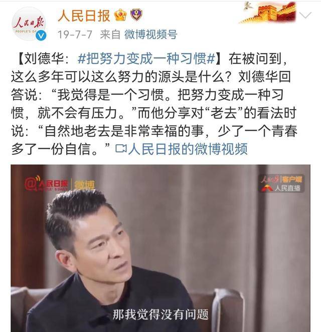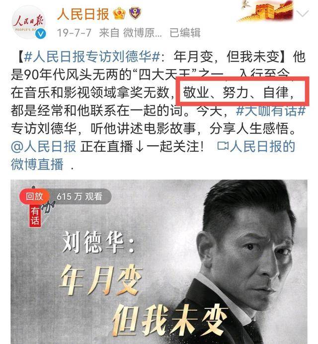 早在2019年,人民日报就点名夸奖过刘德华,说他“敬业、努力、自律”。