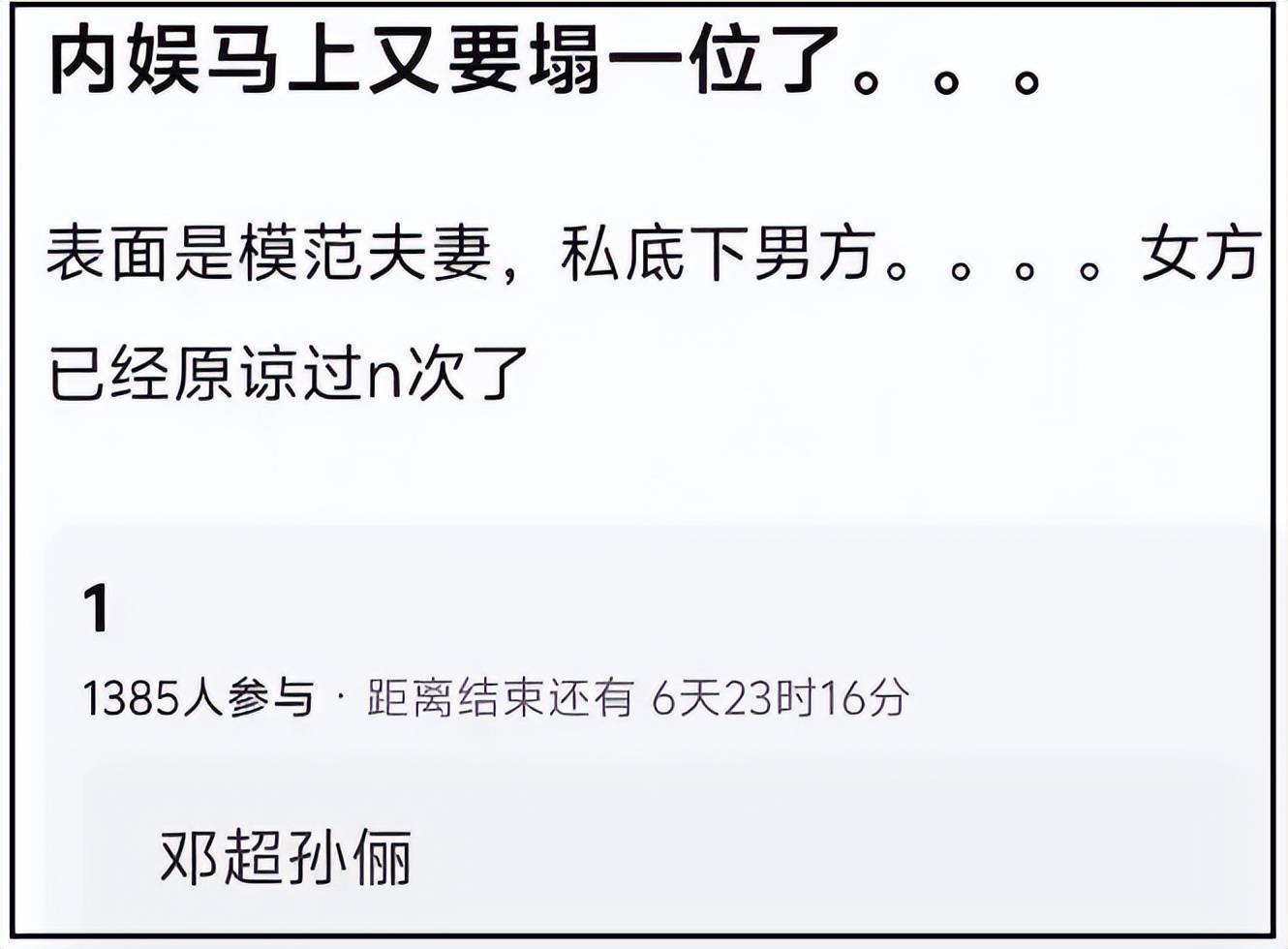 近日,网络屡传“国民女星后院起火”,紧接着那英丈夫被拍夜会美女,当事人迅速辟谣,不到一天流程走完。此后又有爆料称,其实真正后院起火的女星另有其人,俩人表面“模范夫妻”,其实私下男方出轨多次,目标直指邓超孙俪。