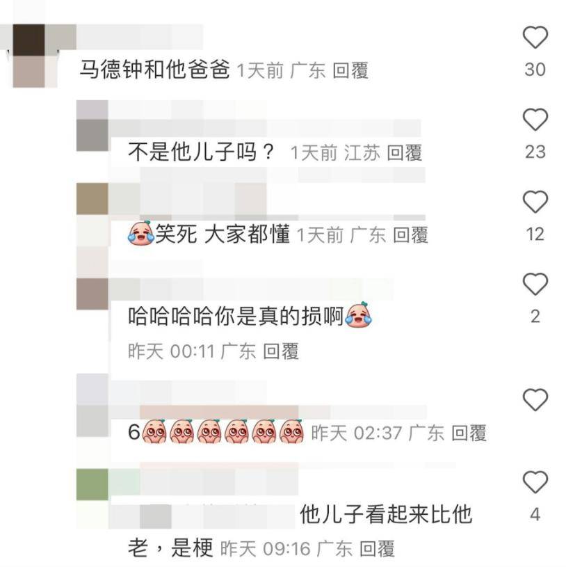 网友回复称:“马德钟和他爸爸”!不知情的网民却留言:“不是他儿子吗?”,其他网民纷纷留言写上:笑死,大家都懂!、他儿子看起来比他老,是梗。
