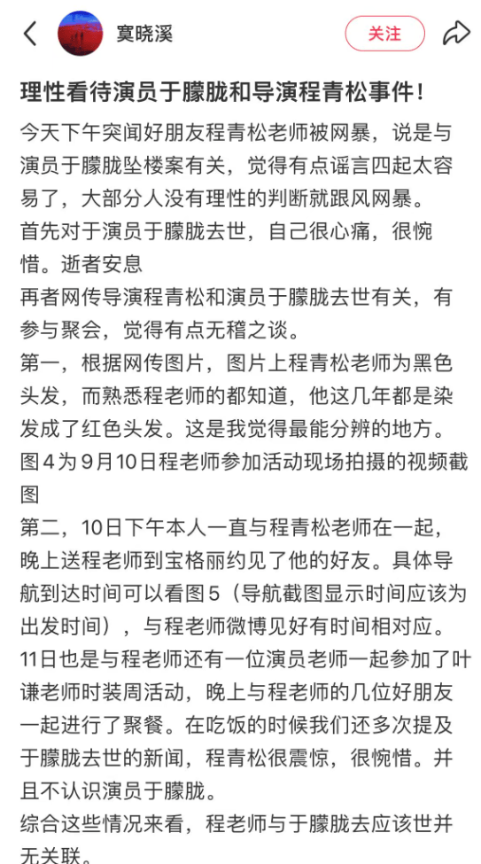 9月11日程青松与朋友一起参加了叶谦老师的时装周活动,也是红发造型,在吃饭的时候也提及了于朦胧去世的新闻,程青松表示很震惊,很惋惜,并不认识于朦胧。