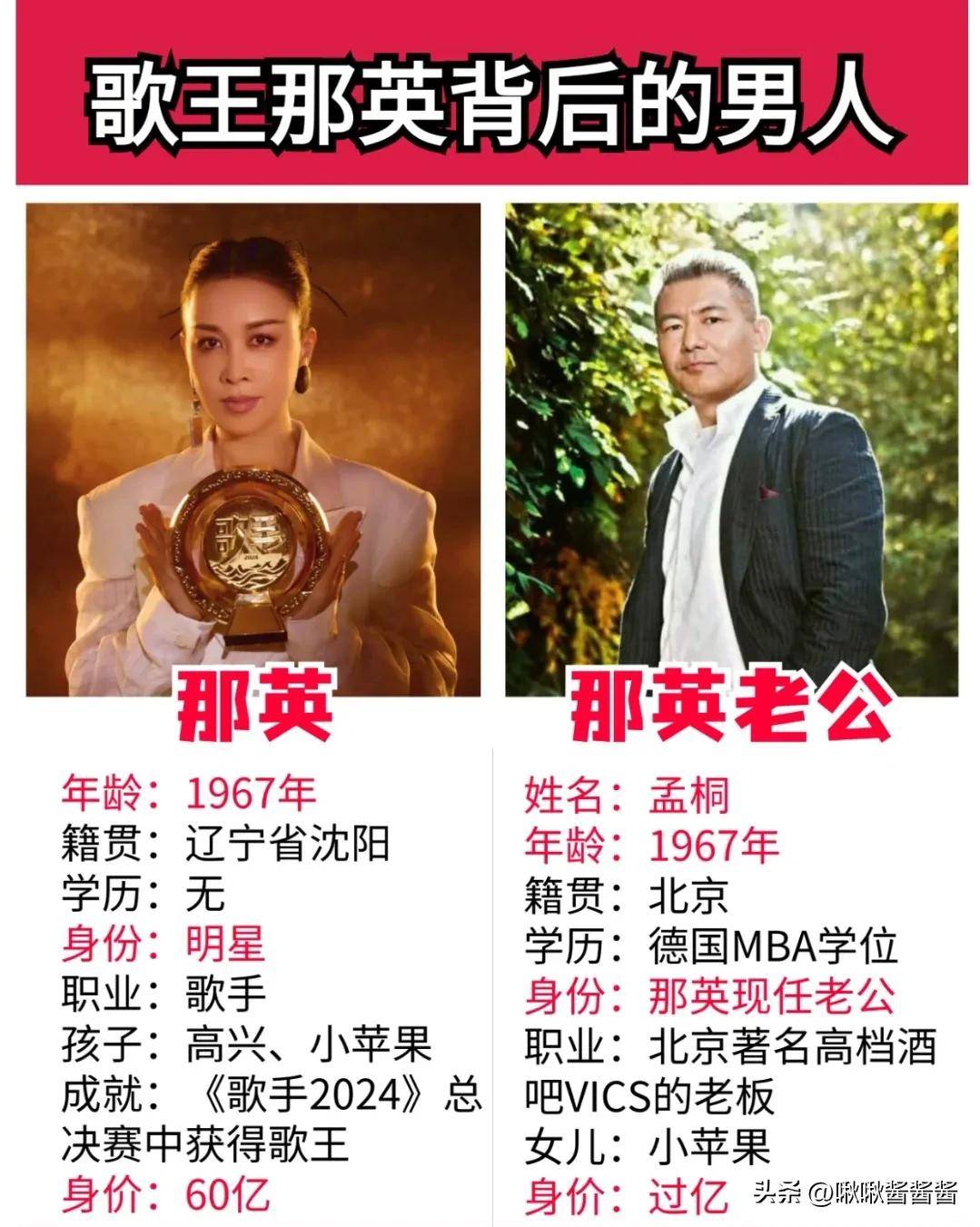 现年58岁的孟桐是北京知名酒吧VICS的创始人,与那英同龄。两人于2006年在加拿大登记结婚,至今已携手走过19个春秋。他们18岁的女儿目前正在英国求学。在《乘风破浪的姐姐》和《花儿与少年》等节目中,那英曾多次公开称赞丈夫,形容他像1"秤砣一样稳重1",并坦言自己被宠得像少女一般。