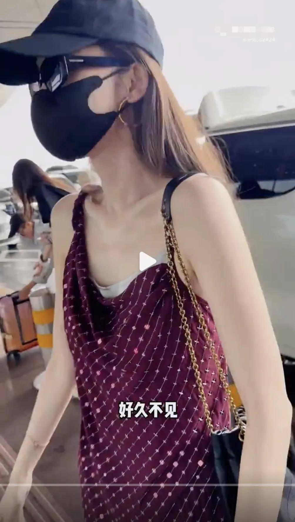 她身穿一件棕色的两件套吊带,下身是简单的裤装,美拉德色系,整个人看着非常苗条和纤细,但是她一点肉都没有,直接成为了皮包骨。