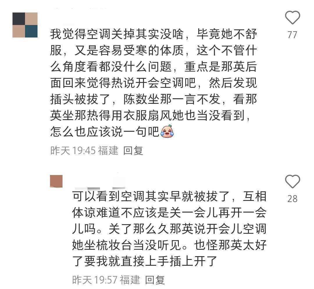 这段画面播出后,网友立刻分成两派。不少人指责陈数太自我:"关空调可以理解,但直接拔电源太霸道了""那英都退让到只说开'一会儿'了,连回应都没有"。也有人翻出前几期的细节:因为陈数怕吵,那英连最爱的摇滚乐都不放了;现在又得忍受高温,包容似乎成了单方面的妥协。