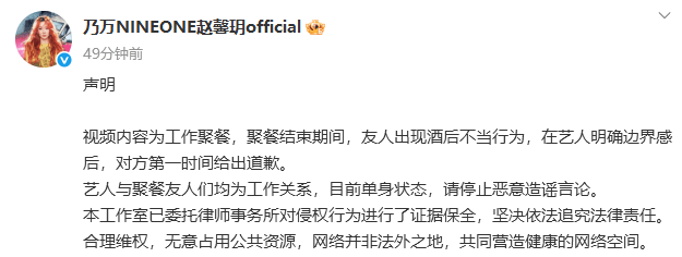 PS:乃万也在昨天回应了这事:“视频内容为工作聚餐,聚餐结束期间,友人出现酒后不当行为,在艺人明确边界感后,对方第一时间给出道歉。艺人与聚餐友人们均为工作关系,目前单身状态,请停止恶意造谣言论。”
