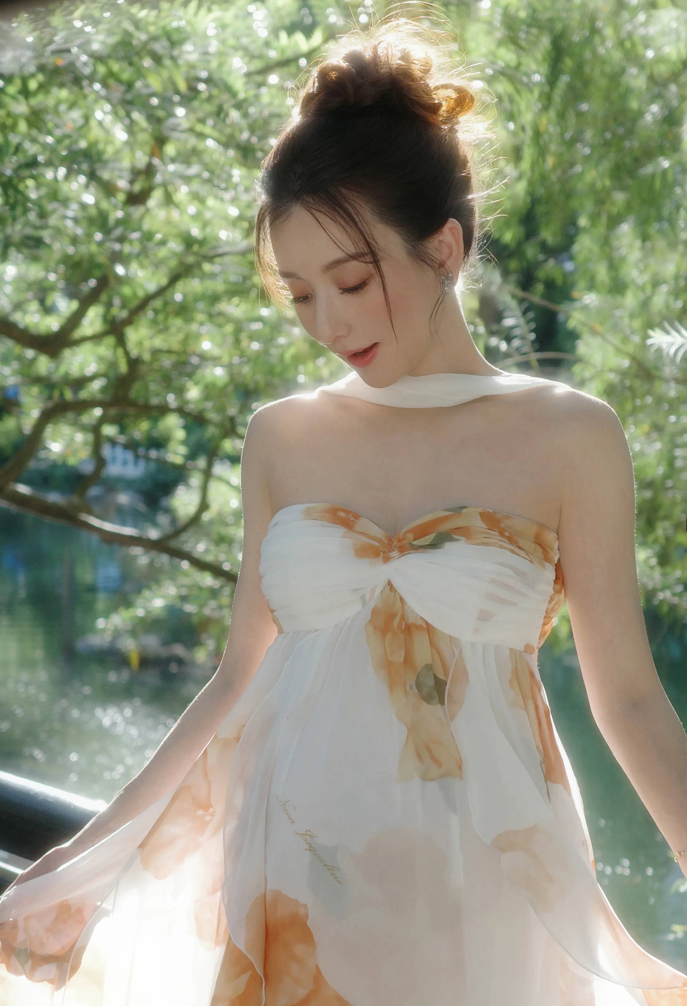 方媛穿碎花抹胸长裙俏丽端庄。
