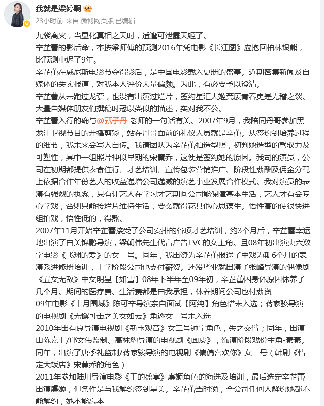 但2015年因《长江图》资金困境及发展理念不合,辛芷蕾于梁婷生日当天(9月9日)提出解约诉讼,指控“经纪不作为”。