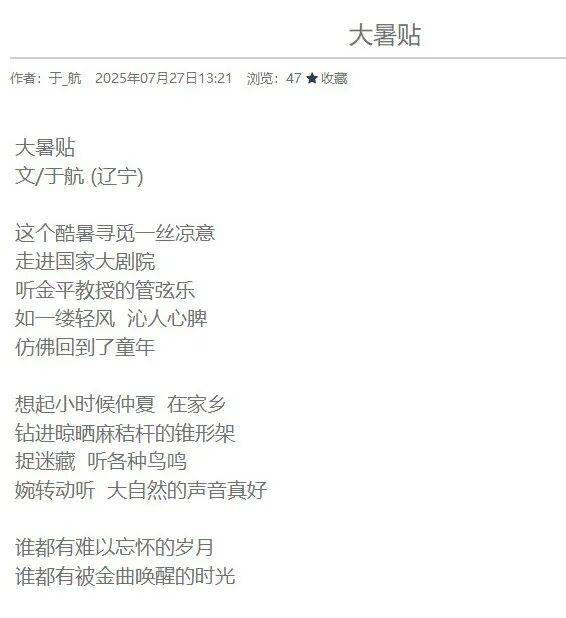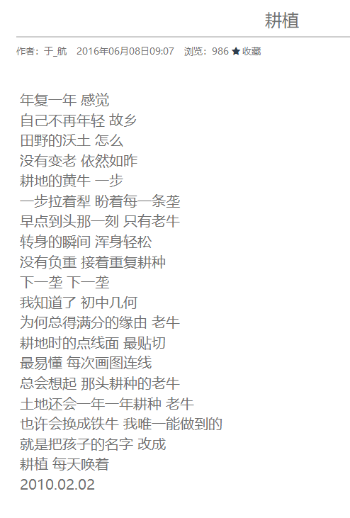 于航直到现在还在写诗,颇为高产,他在一个很不起眼的网站上创作,点击率并不高,没人知道他就是大明星于适的爸爸,我们先来欣赏两首于航的最新诗作。
