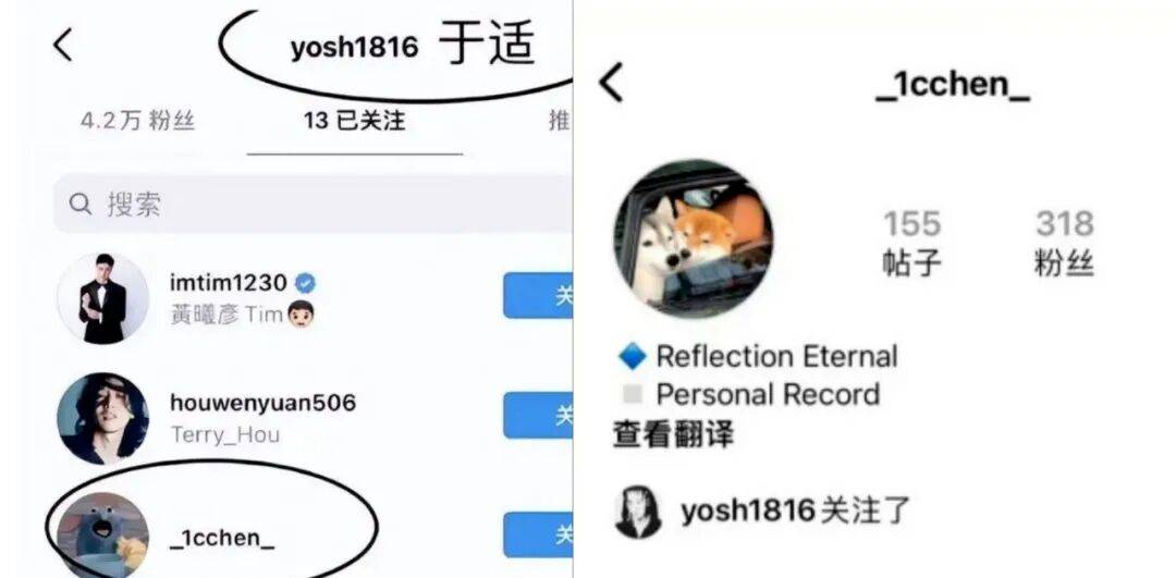 网传罗晨的Instagram,于适、黄曦彦都关注了她。