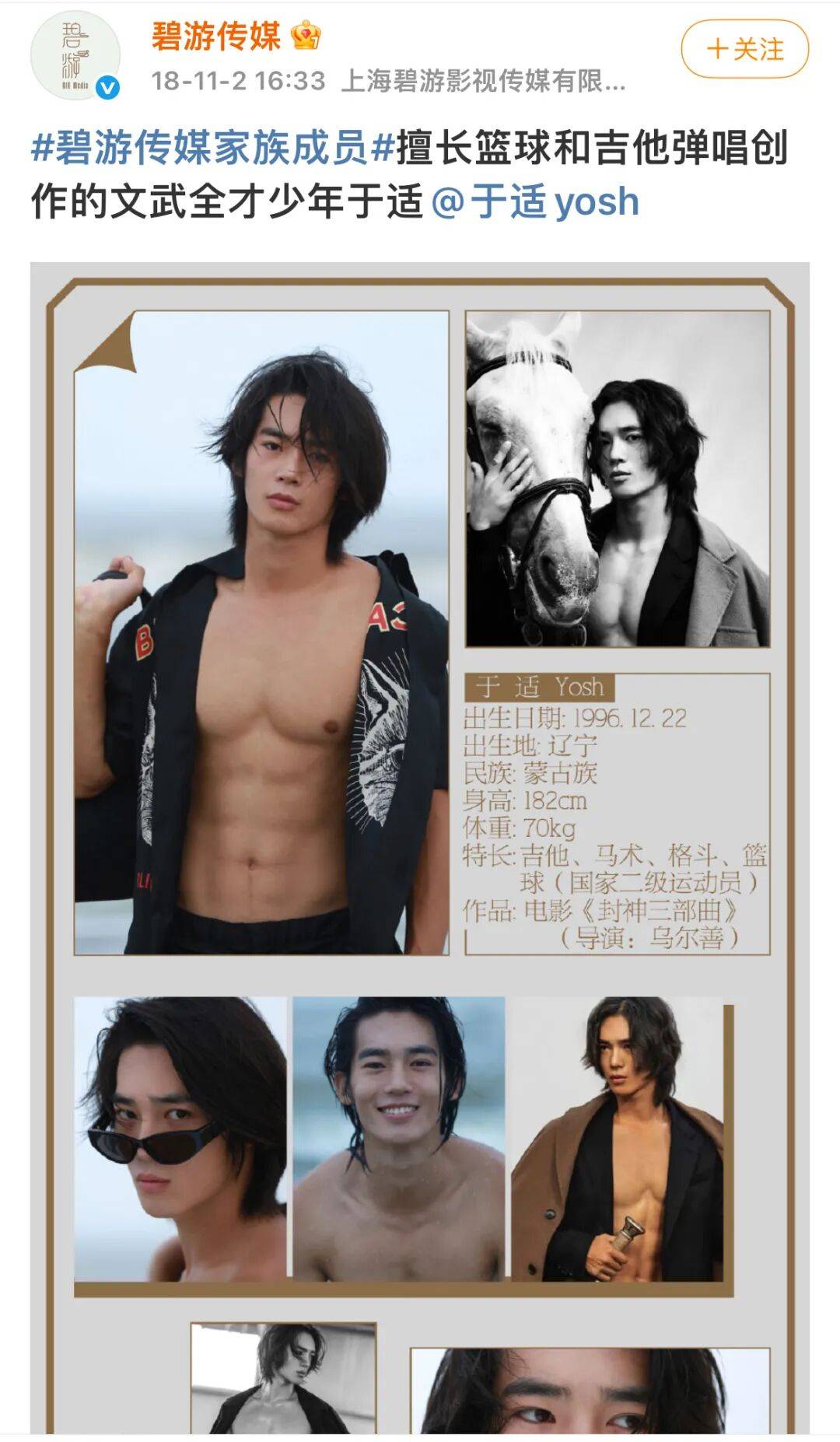 于适微博介绍中的这一长串技能,没什么掺水的余地,会就是会,不会就是不会。一个男演员技能越多,不仅观众好感度强,能接到的剧本范畴就越广,这也是他背后的公司以及制片人会对他看好的原因。