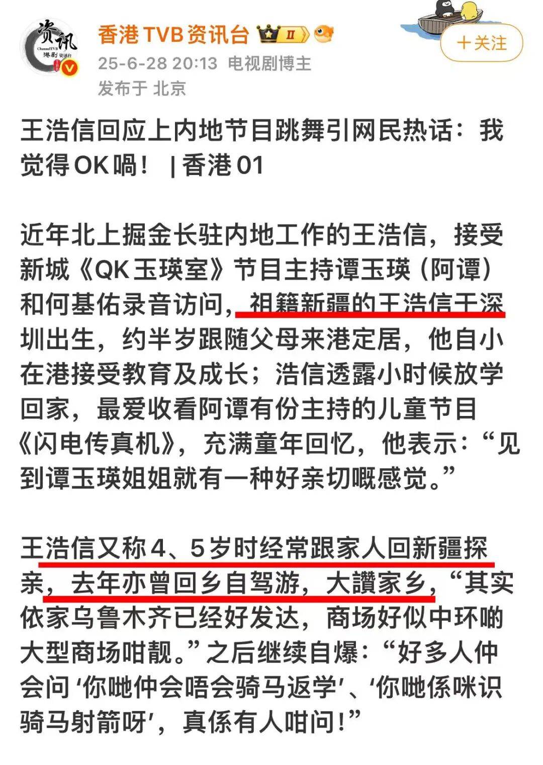 之后的采访于适又强调了一遍,说妈妈是蒙古族,并且说“妈妈也完全不会说蒙语”。