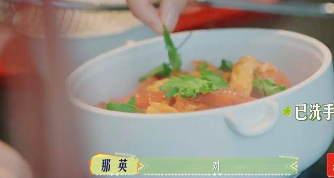 刚见面时,陈数给大家做西红柿炒蛋,装盘时用手撒了一把香菜,花字贴心打上:已洗手。