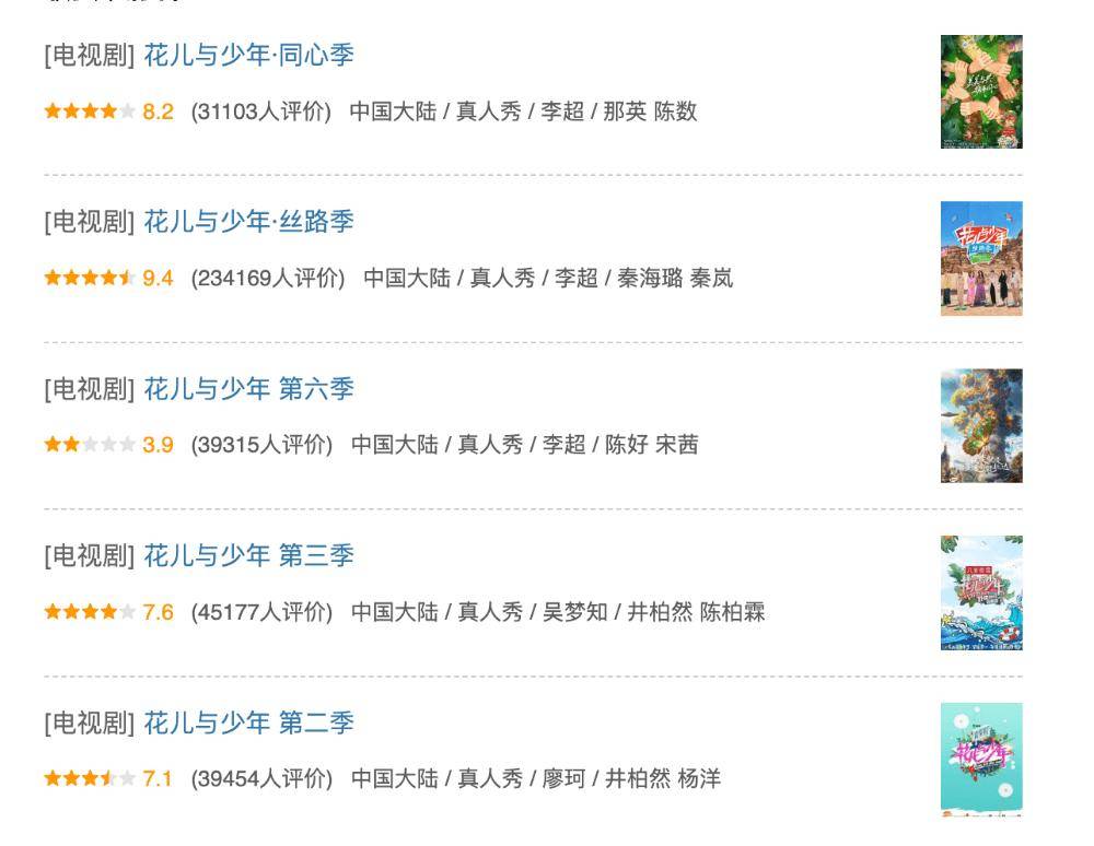 《花少》系列,第三季“无年龄差的朋友关系”,轻松自然;第五季高开9分,被认为是系列的巅峰;第七季延续温柔治愈路线,开分也在8分以上。