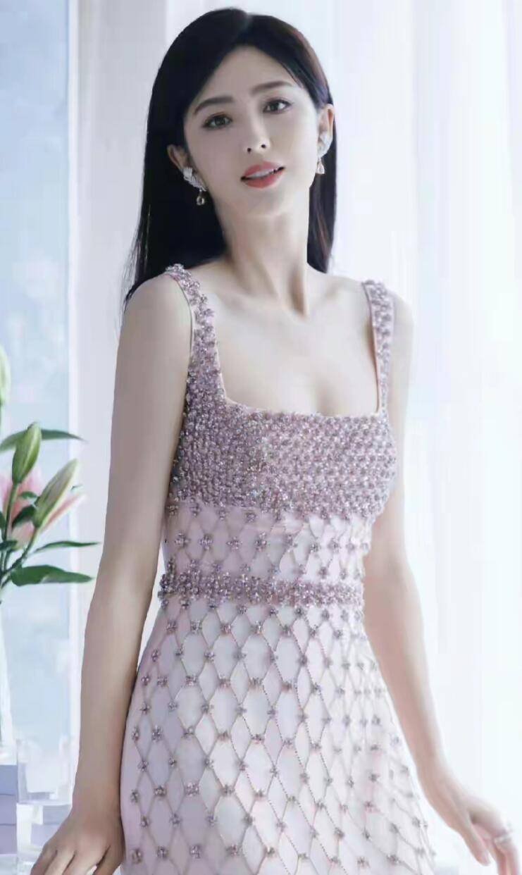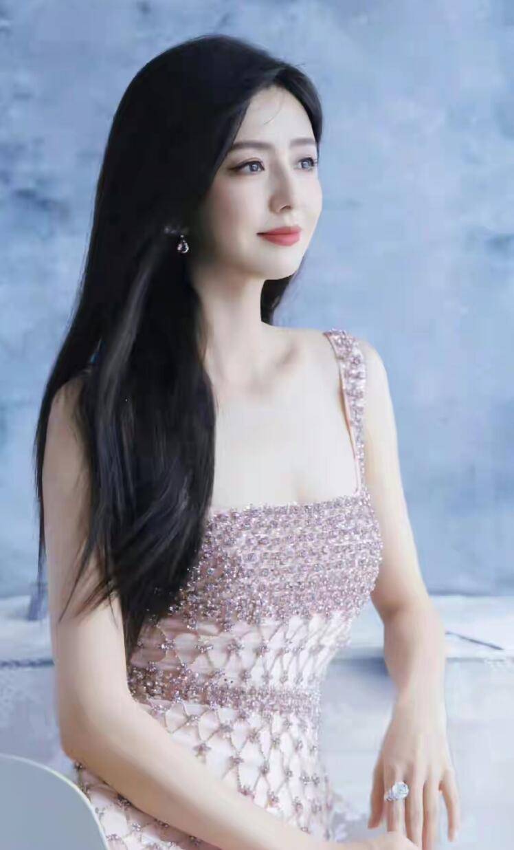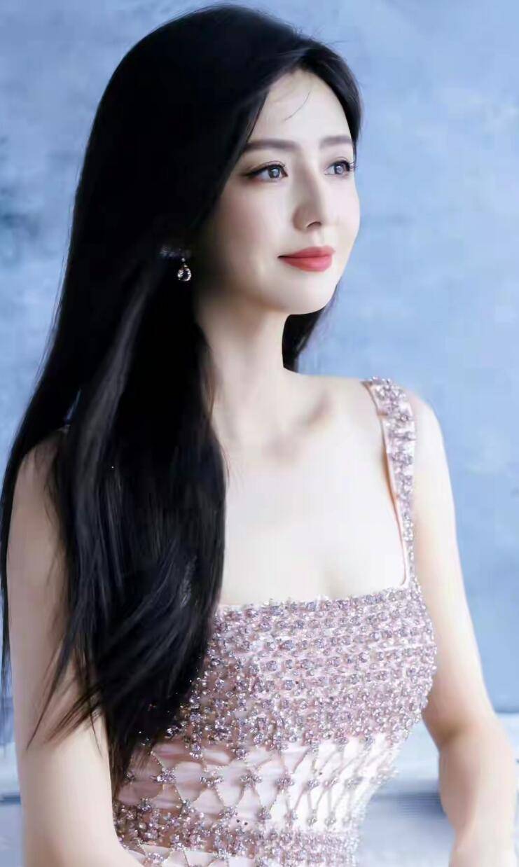 佟丽娅长发仙成画中人,粉钻裙搭配耳环非常优雅
