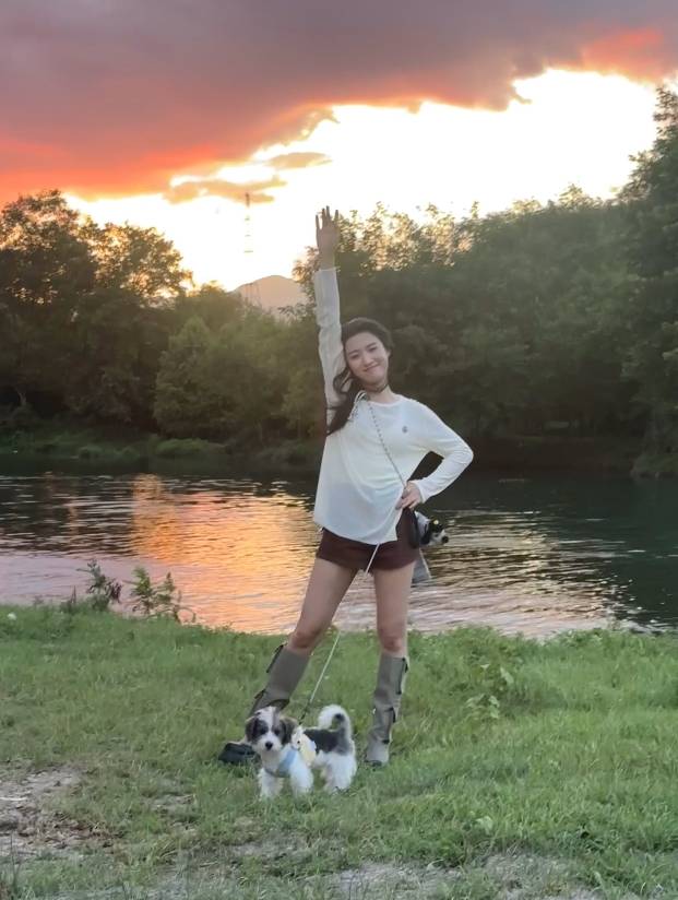卢昱晓牵着狗狗与夕阳合影,笑容灿烂,心情大好!
