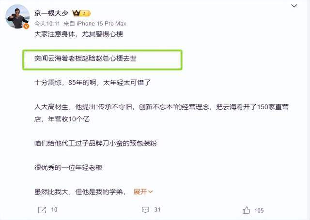 一位自称其学长的网友透露,赵晗是因为心梗导致的噩耗。结合餐饮人的特点分析,赵晗应该是熬夜忙碌导致的突发急症。