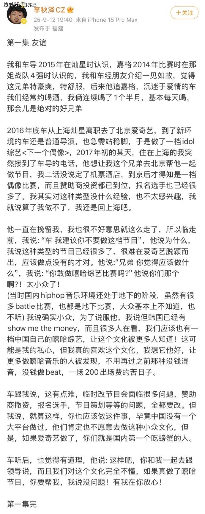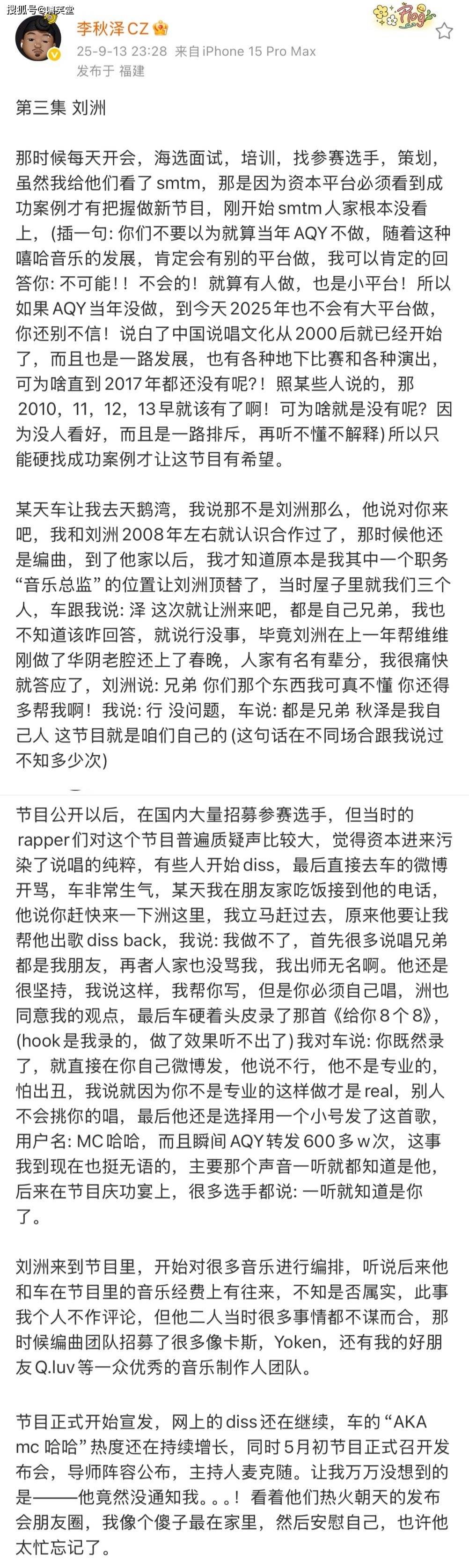 在第一篇中,李秋泽谈到了和车澈筹备《中国有嘻哈》的往事。