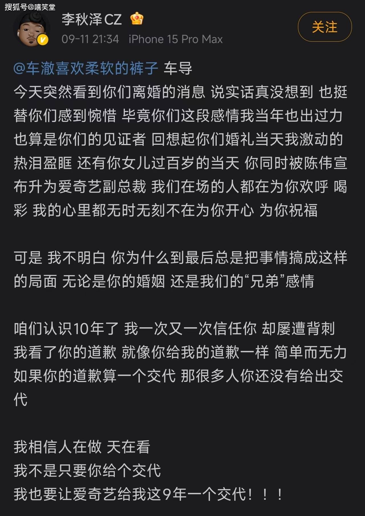 不得不说,李秋泽发文的目的,就是让车澈给他一个交代。