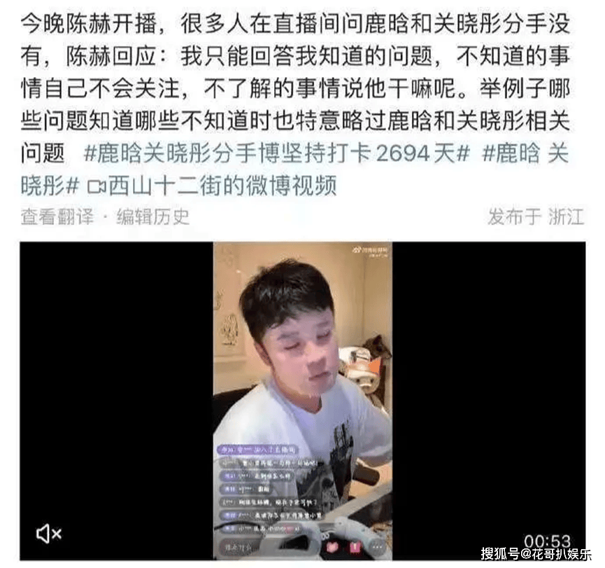 好友陈赫直播时,有网友问及鹿晗感情状态,陈赫也没有明说,而是含糊其辞,说自己不知道不会说。