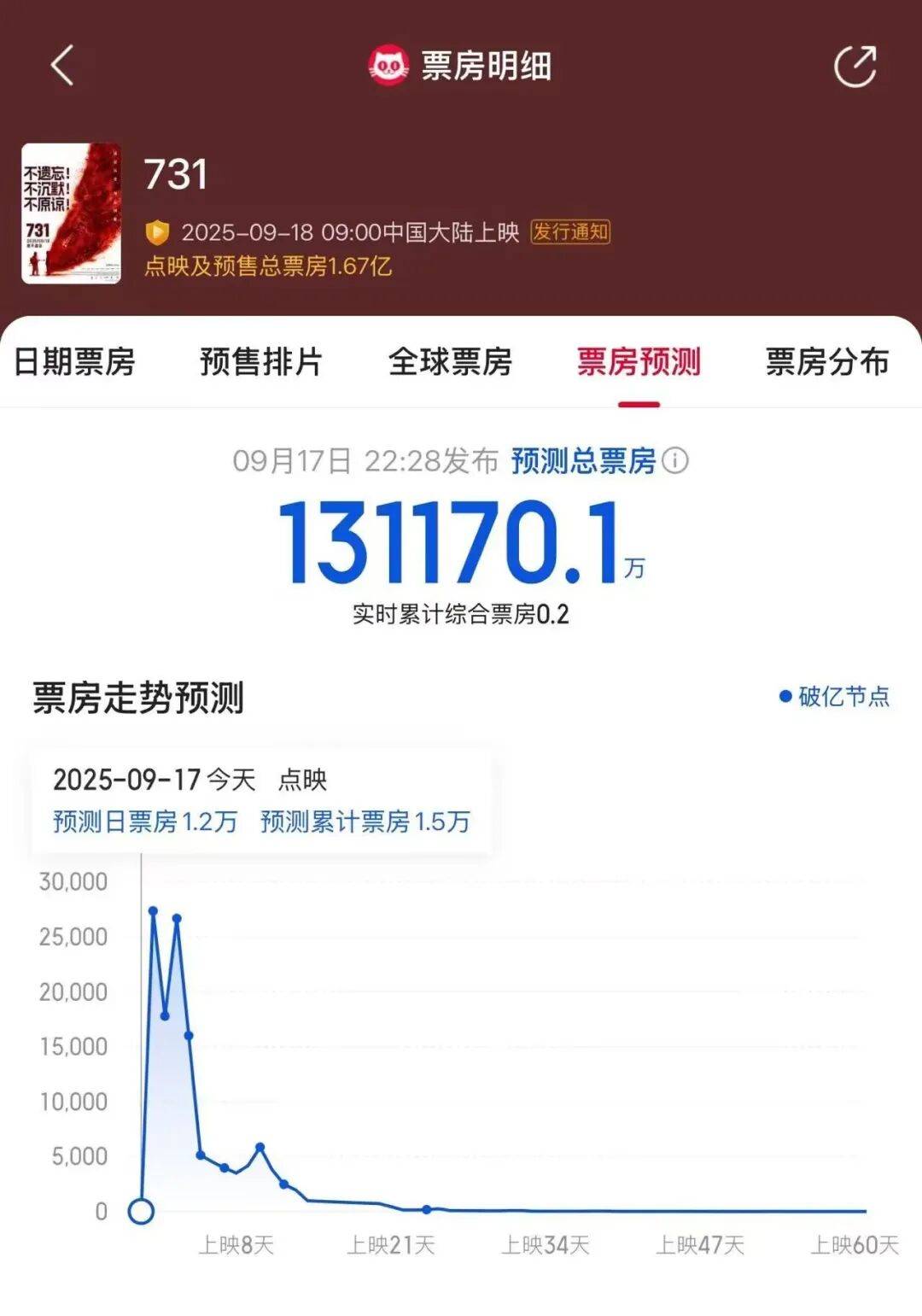 同时,《731》预测票房目前已出,大数据预测该片总票房有望达到13.11亿。
