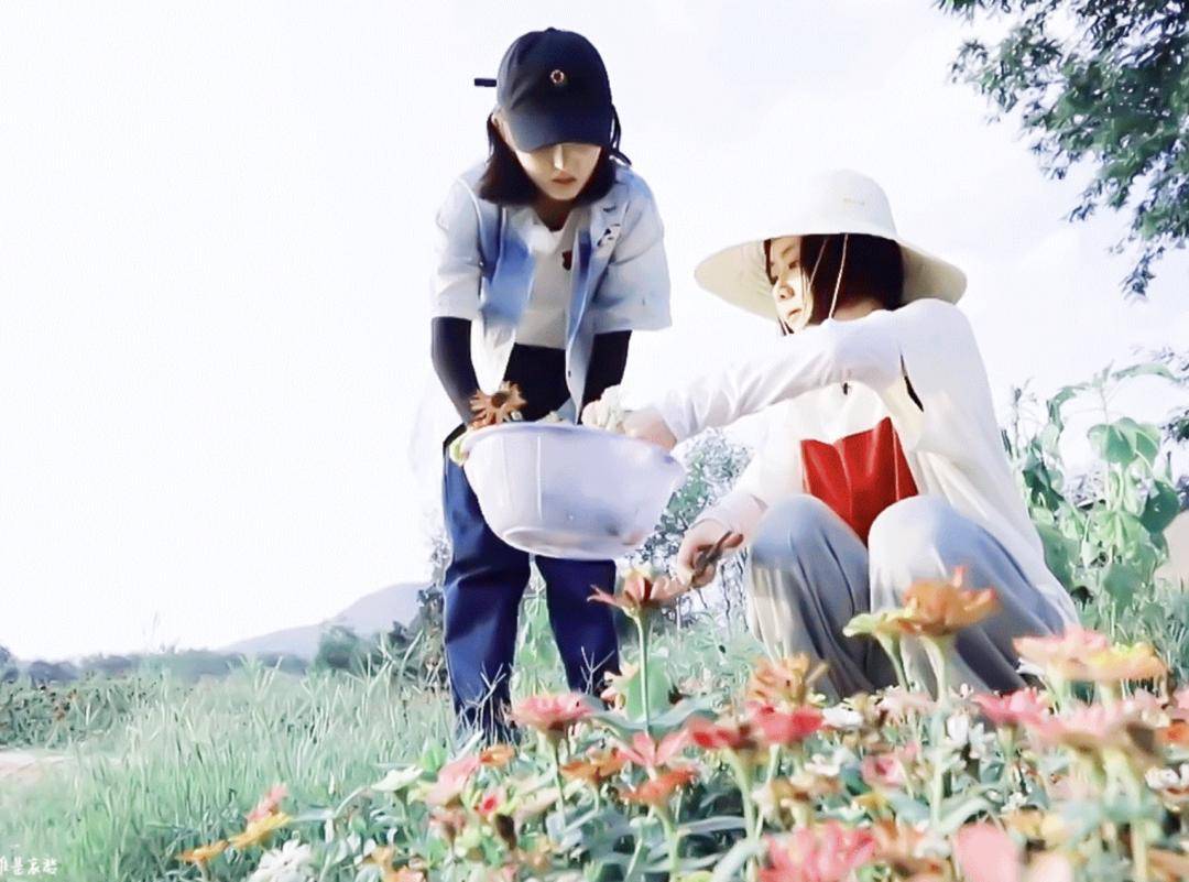 在最新一期节目录制中,两位演员终于实现了同框的心愿。此前谭松韵曾遗憾表示未能与张子枫相见,如今这个遗憾得以弥补。曝光的节目片段里,两人身着休闲装扮,在田野间采摘野花的画面格外动人。谭松韵头戴编织草帽,专注修剪花枝的模样充满田园诗意,而张子枫则在一旁尝试将野花别在发间,两人自然流露的欢快氛围感染着每位观众。