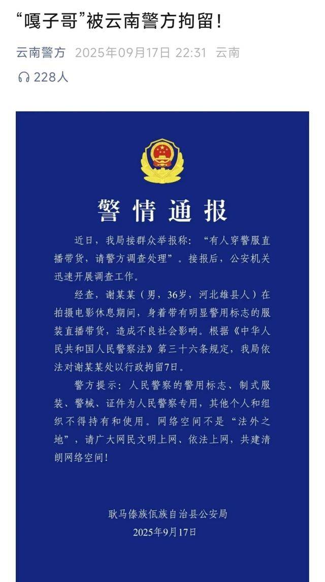 9月17日深夜,警方的一纸通报,让演员谢孟伟再度进入人们的视野。通报中写道:“经查,谢某某(男,36岁,河北雄县人)在拍摄电影休息期间,身着带有明显警用标志的服装直播带货,造成不良社会影响。