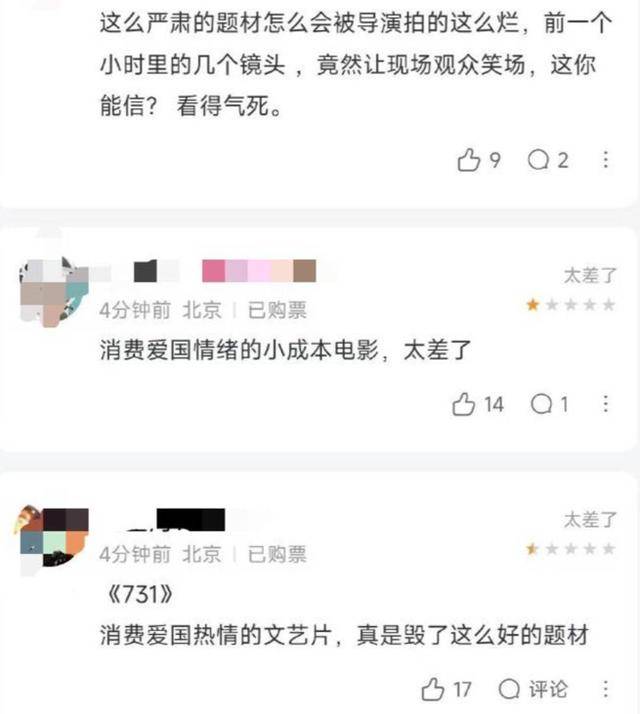 除了那些家长,还有些上百万粉丝的大博主和自认为专业的影评人,也跟着凑热闹打差评,他们从拍电影的技术角度挑刺,说片子叙事乱、镜头拍得平淡,把它归到烂片里,不可否认,《731》在讲故事的结构、导演的拍摄手法这些方面,确实有可以改进的地方。
