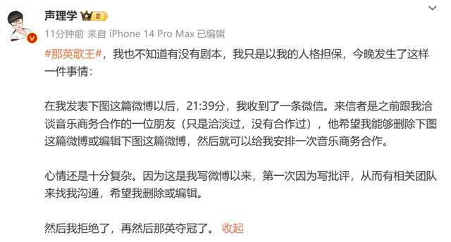 该业内人士还表示有团队以商务合作为由要他删除批评那英的相关微博,并对此番话负法律责任。根据他的微博来说,他质疑那英选择回春丹是为了衬托自身的音准水平,而煽情的朗诵则是耍赖的表演,太低级。就这两篇来说,确实无法判断那英是否拿了剧本,但是要求删差评确实玻璃心。